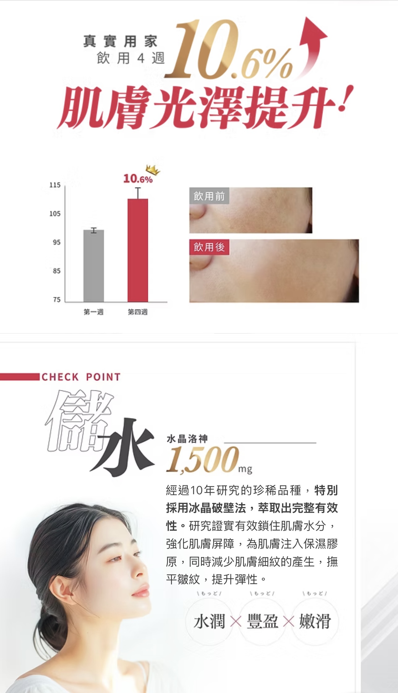 蘊含醫療級膠原三胜肽5000mg,更針對十大皮膚問題,加入余甘子、水晶洛神、透明質酸、輔酶Q10及神經醯胺,每瓶活性成分超過26000mg,有助激活膠原蛋白合成,幫助重組及緊密膠原纖維,支撐皮膚底層;抑制AGEs與黑色素生成,強效抗醣化。