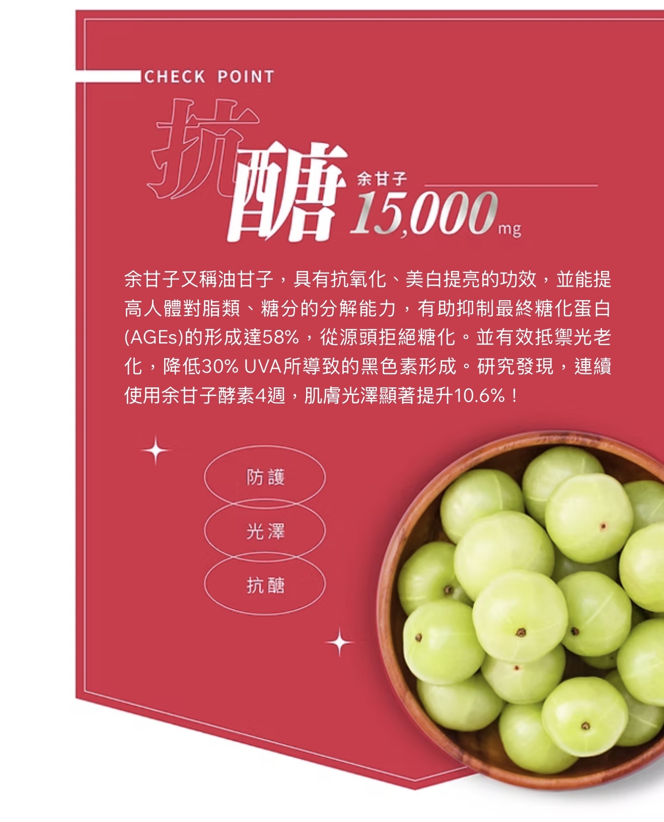 水、膠原液、余甘子酵素液、赤藻糖醇、蘋果濃縮果汁、水晶洛神萃取液、檸檬酸、DL-蘋果酸、輔酵素Q10粉、複合紫蘿蔔濃縮汁、蔓越莓覆盆子液態香料、阿拉伯膠、綜合莓果天然液態香料、玻尿酸 (含透明質酸鈉)、甜菊醣苷(甜味劑)、大豆卵磷脂、米萃取(含神經醯胺)
